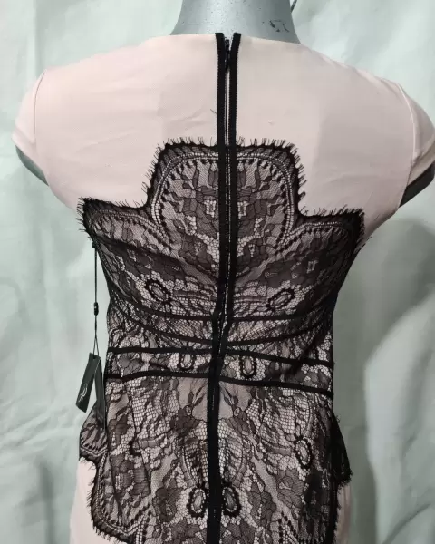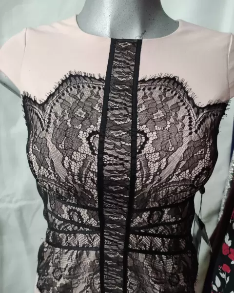 Vestido mini recto con encaje. Vestido recto mini, linda aplicación de encaje por ambos lados , manga corta. La medida del maniquí de ziza a ziza 51 cm.La tela estira un poco