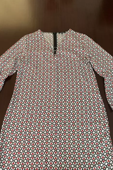 Vestido Moderno Estampado discreto. Vestido suelto de poliéster, rojo y negro, fabricado en Brasil, con manga de lámpara, escote en V. 92cm largo, 42cm hombro, 43cm manga.