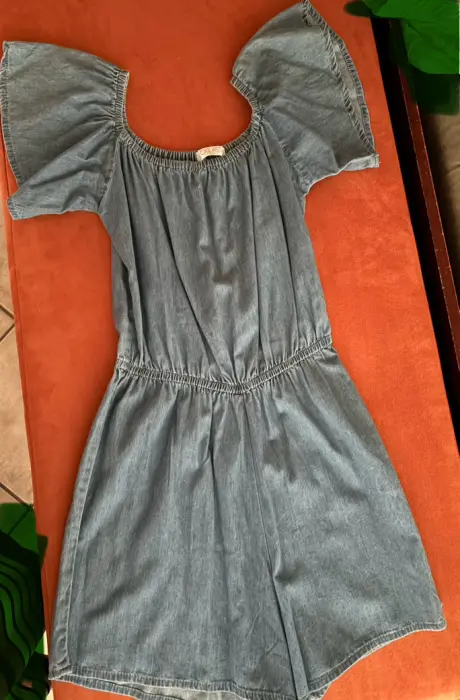Vestido mono. Mono de tela de mezclilla, corto y comodo, con elástico en la parte alta que deja al descubierto los hombros