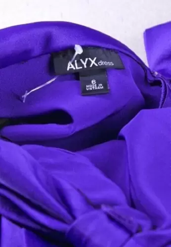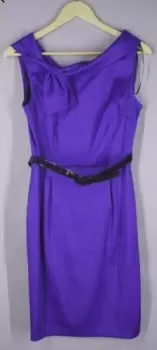 Vestido morado con cuello tipo barco Talla S. Vestido morado con cuello tipo barco con moño, tela satinada, súper lindo y elegante, tiene cinturón negro, abertura en la parte baja-trasera del vestido, para permitir el libre caminar.