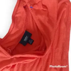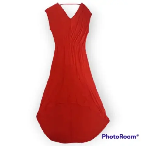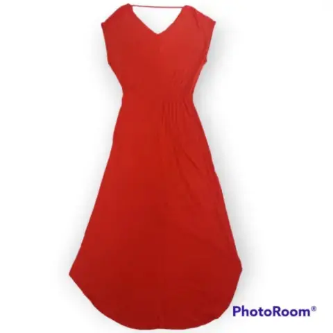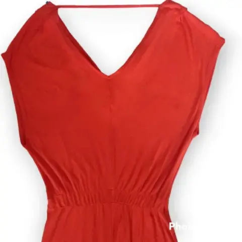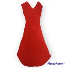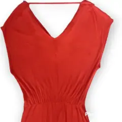 Vestido Mossimo t M cuello V atras y adelante, cinta trasera en cuello para mantener firmeza en la prenda, color rojo brillante resorte en cintura, corte cola de pato material 95% rayón 5% spandex 45cm axila a axila 23cm profundidad de sisa 103cm largo frente 137cm largo atrás