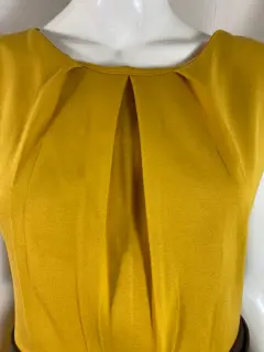 Vestido mostaza c/cinturon. Vestido color mostaza en tela gruesa Strech con cuello redondo y pliegues en el escote, con bolsas y cinturón incluido, lleva a la rodilla