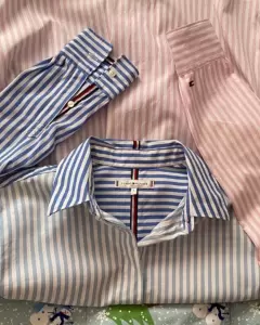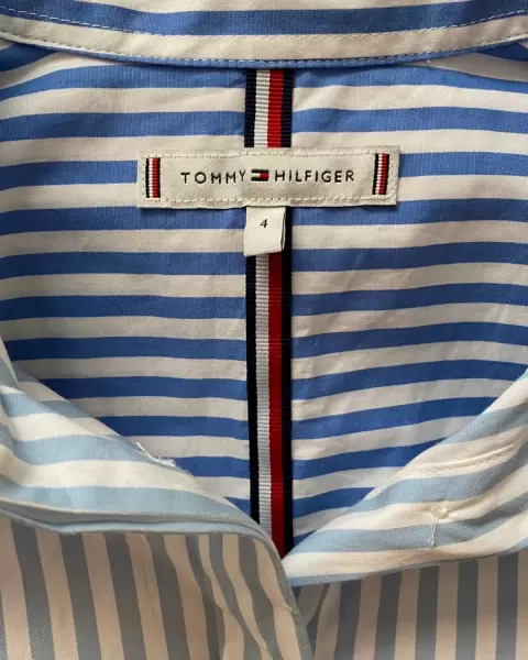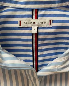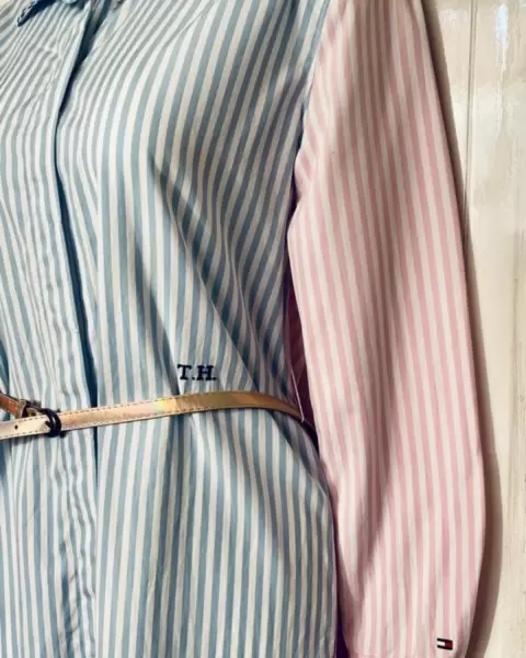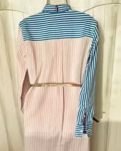 Vestido multicolor original, la marca grabada en botones y bordado en la manga y la parte frontal. El listón característico de la marca en las orillas de las mangas. Incluye el cinturón