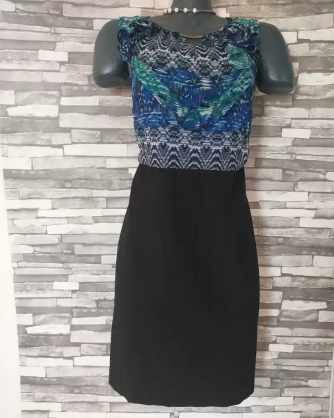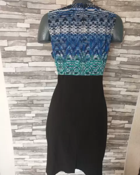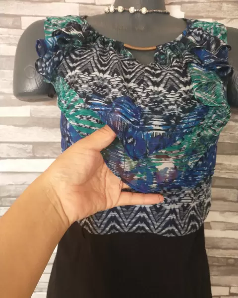 Vestido multicolor. Hermoso vestido talla 18 falda negra y lo de arriba es tela de gasa delgada con forro trae un adorno dorado en el frenteLas medidas sonAxila a axila 59 cmCintura 50 cmCadera 60 cmLargo total 96 cm