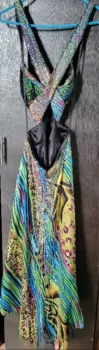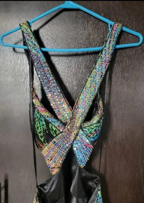 Vestido multicolor con lentejuelas bordadas y chalina de la misma tela, espalda descubierta y corte asimétrico talla chica tirantes cruzados con escote espalda baja