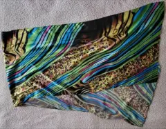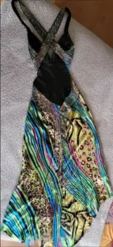 Vestido multicolor de noche con chalina. Vestido multicolor con lentejuelas bordadas y chalina de la misma tela, espalda descubierta y corte asimétrico talla chica tirantes cruzados con escote espalda baja