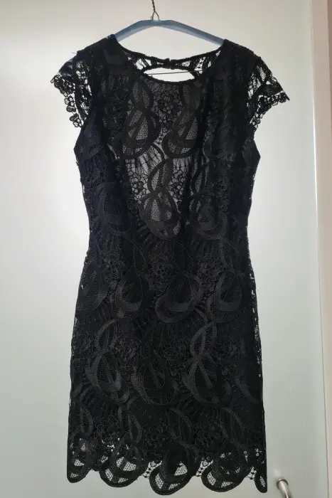 Vestido negro. VESTIDO ARRIBA DE LA RODILLA, NEGRO DE ENCAJE, CON FORRO NEGRO, ESCOTE EN LA ESPALDA.