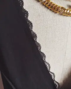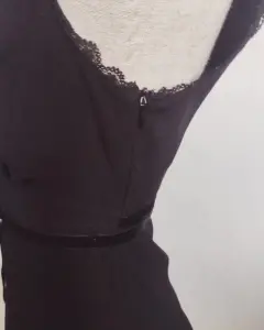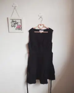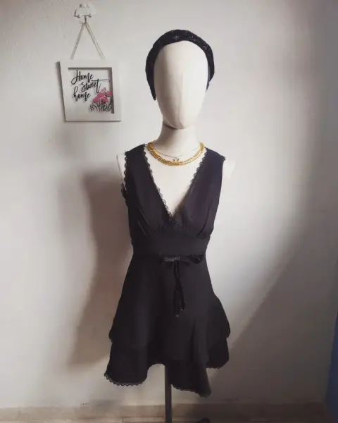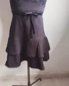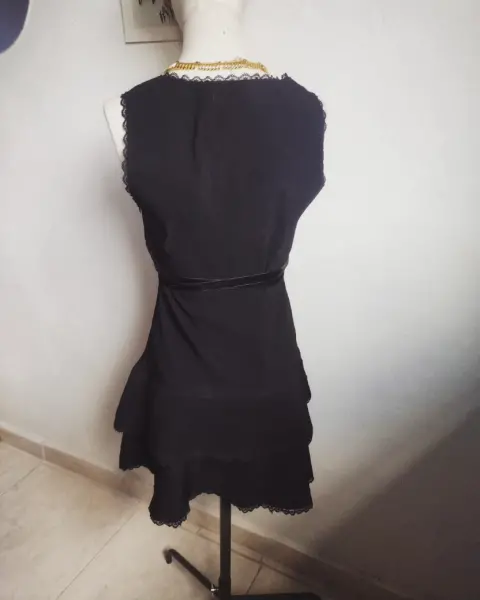 Hermoso vestido negro, con olanes en la falda, cinta para ajustarse y cierre lateral.