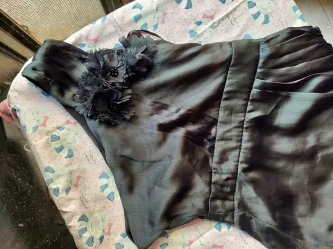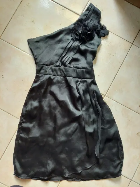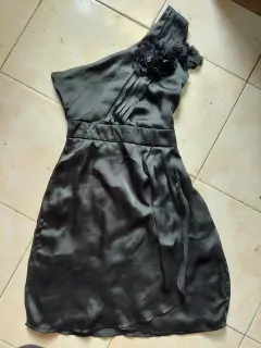 Vestido negro. Vestido corto color negro,de una !anga con detalles de flores ,tiene cierre a un costado