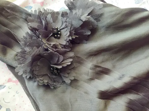 Vestido corto color negro,de una !anga con detalles de flores ,tiene cierre a un costado