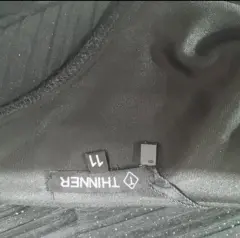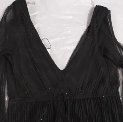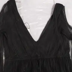 Vestido de fiesta en color negro con escote en "v", la tela es negra con brillitos dorados, trae un bonito efecto en las mangas.