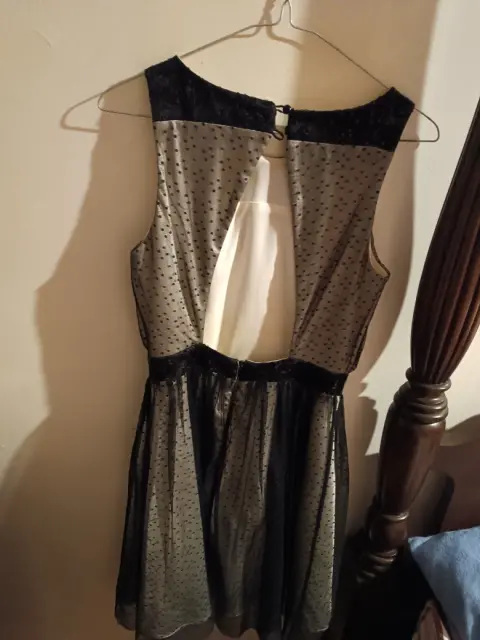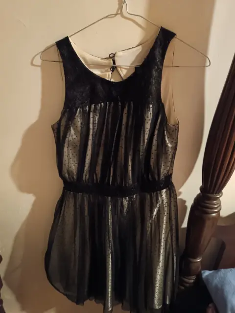 Vestido negro con tul , trae lentejuelas y puntos . Se ve súper lindo, lo compre en Sears