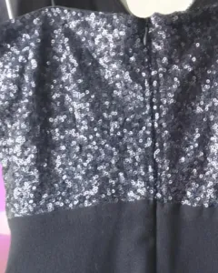 Vestido negro con lentejuelas, escote en V, tirantes super delgados.