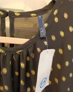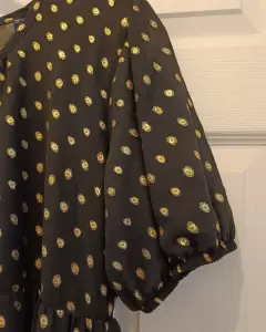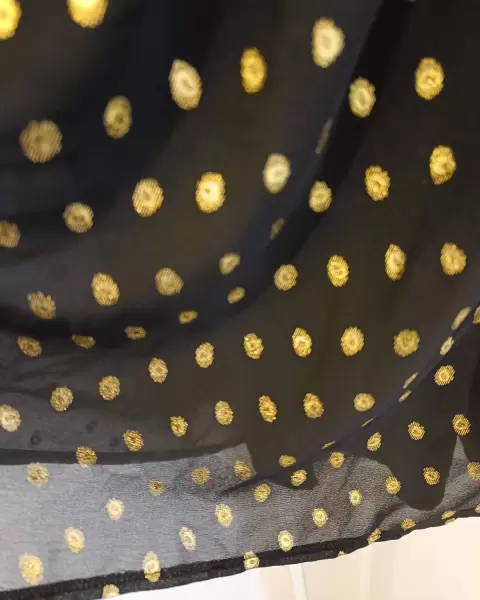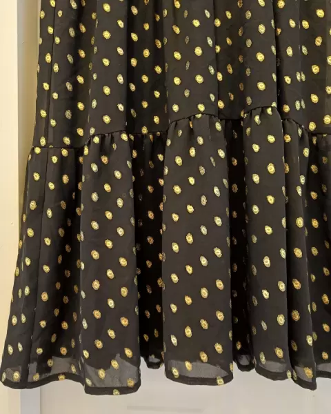 Vestido negro de chifón a lunares dorados, con fondo negro.Largo bajo la rodilla.Nuevo sin usar, con etiqueta.