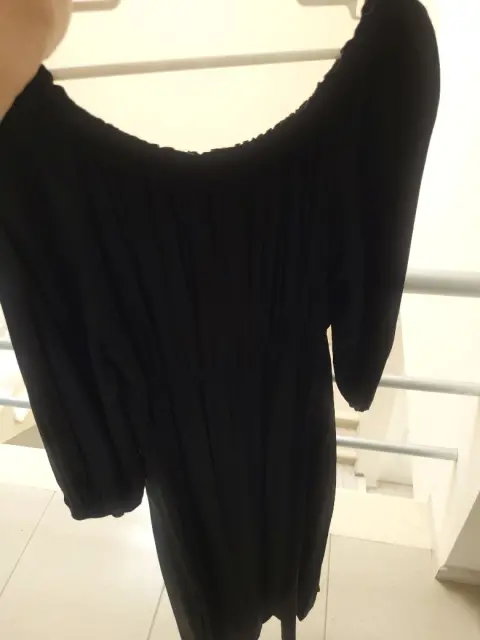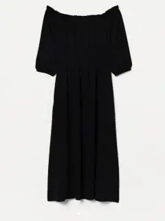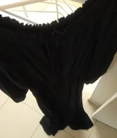 Vestido negro a los hombros. Vestido negro en tela viscosa satinada, largo midi, escote a los hombros, elastico en cintura, largo midiMedidas: axila a axila 52m3, largo 110