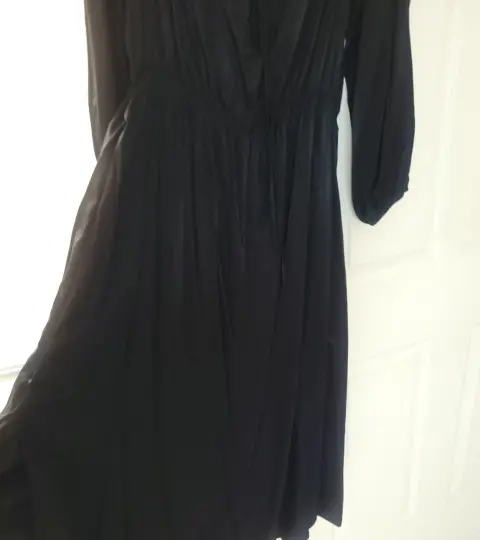 Vestido negro en tela viscosa satinada, largo midi, escote a los hombros, elastico en cintura, largo midiMedidas: axila a axila 52m3, largo 110