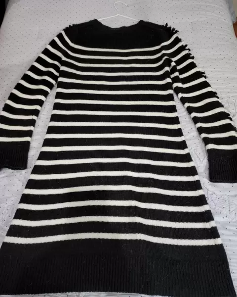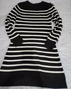 Vestido negro a rayas blancas y manga larga. Vestido tejido negro con rayas blancas y manga largaCon pompones de adorno en lo largo de la mangaTALLA S/MExcelente estado, sólo una puesta
