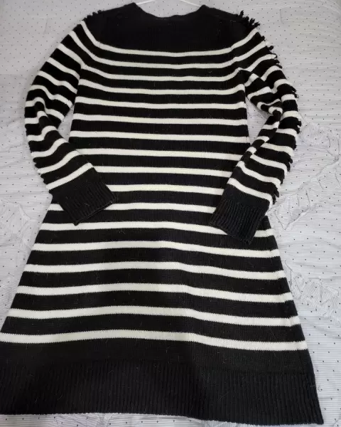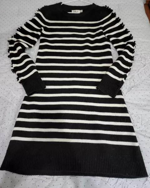 Vestido tejido negro con rayas blancas y manga largaCon pompones de adorno en lo largo de la mangaTALLA S/MExcelente estado, sólo una puesta
