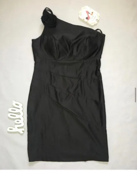 Vestido marca Xenia, color negro, talla 9 que le queda a una Mediana, es de un hombro descubierto, en el hombro con tirantes trae una hermosa flor de la misma tela,
