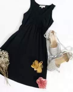 Es un vestido lindo, cómodo, fresco, tela 100% algodón, en tono negro con mucho strech. Mide de axila a axila: 42 cm, hombros: 31 cm, largo: 82 cm.