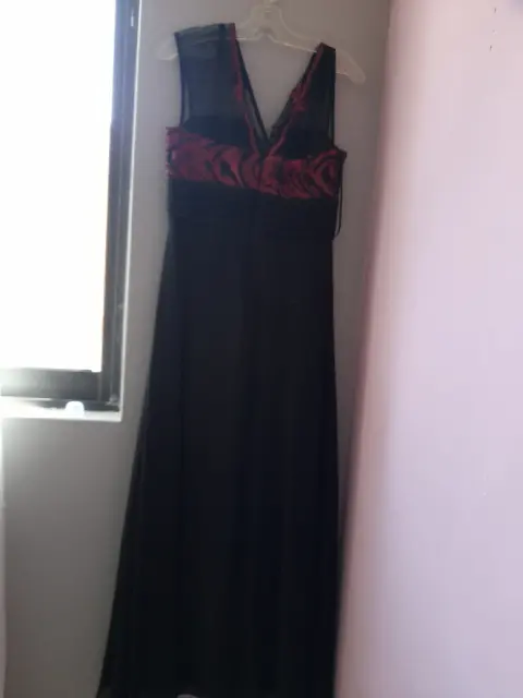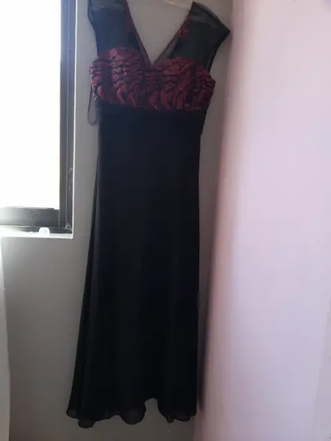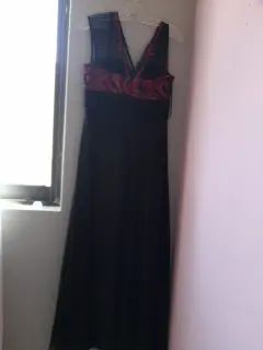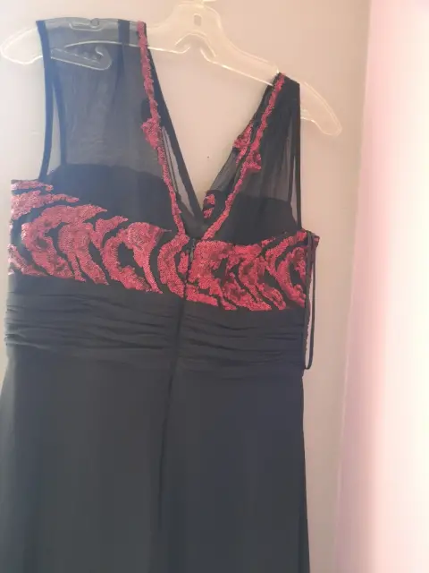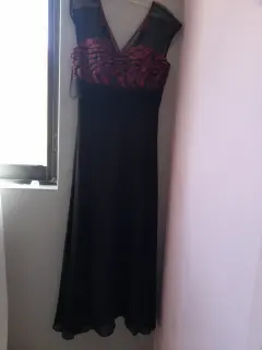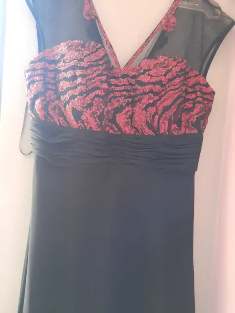 Lindo vestido de noche negro con aplicaciones elegantes en color rojo puesto unas horas