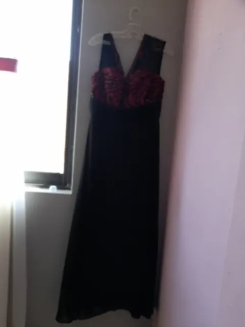 Vestido negro con aplicaciones rojas en talla 32. Lindo vestido de noche negro con aplicaciones elegantes en color rojo puesto unas horas