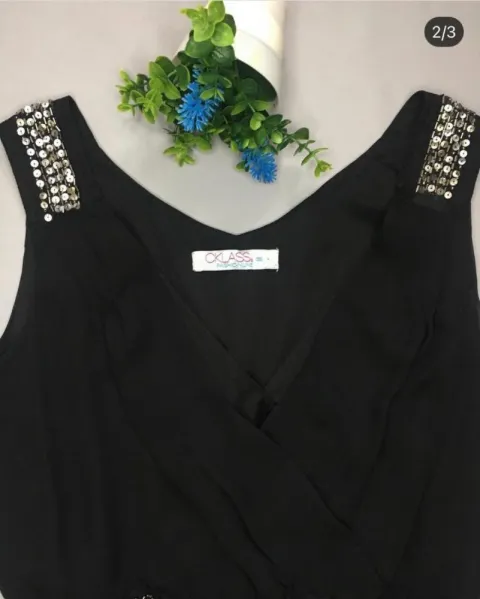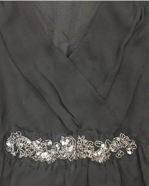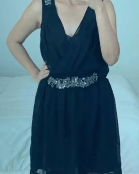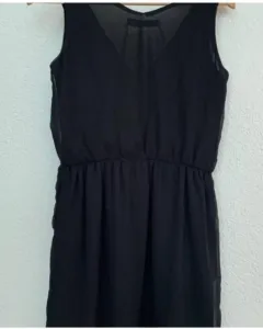 Vestido negro de gasa, tiene forro, el largo es discreto casi a las rodillas, tiene apliques de pedrería en hombros y cintura que ayudan a resaltar la cintura, talla Mediana que le podría quedar también a talla Chica