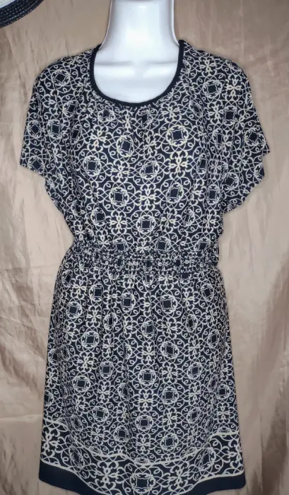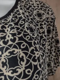 Lindo vestido con diseño negro con beige. Nuevo, talla XL.Es de manga corta, cuello redondo, resorte en la cintura, largo a la rodilla dependiendo tu estatura.Poliéster 95% - 5% espandex