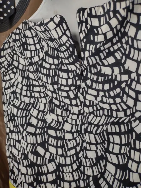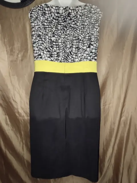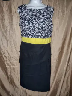 Vestido negro con blanco. Nuevo, talla XL.Vestido sin mangas, escote de ojal, con cintilla amarilla en la cintura, la parte de adelante de la falda tiene olanes, con cierre en la espalda.97% Poliéster - 3% elastanoHombro: 39 cmAxila: 55 cmCintura: 52 cmLargo: 98 cm