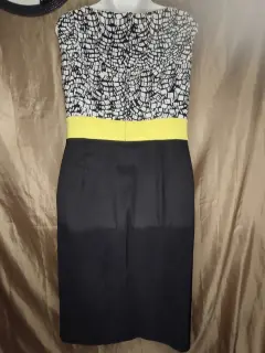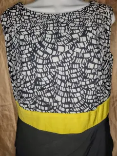 Vestido negro con blanco. Vestido negro con blanco. Nuevo, talla XL.Vestido sin mangas, escote de ojal, con cintilla amarilla en la cintura, la parte de adelante de la falda tiene olanes, con cierre en la espalda.97% Poliéster - 3% elastanoHombro: 39 cmAxila: 55 cmCintura: 52 cmLargo: 98 cm
