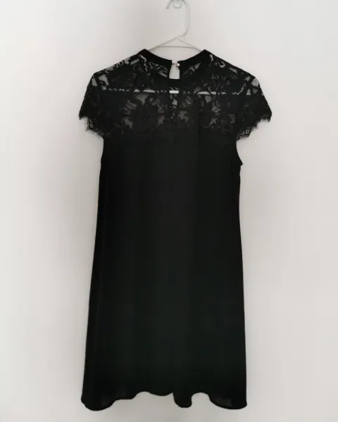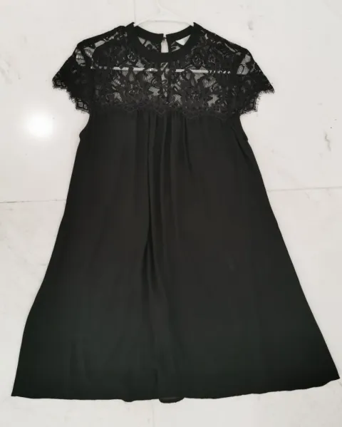 Vestido de tela tipo chifón, color negro. Con encaje en la parte superior, en frente y a la espalda y en las mangas. El vestido es línea A y tiene zurcido en el pecho. Talla M.