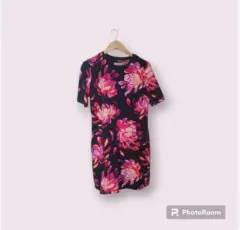 Vestido negro con flores en tonos rosas.. Vestido de tela tipo Spandex, se amolda muy bien al cuerpo, es M pero llega hasta talla L, del hombro a abajo mide 88 cm, no tiene detalles solo se uso en una ocasión y se guardo.