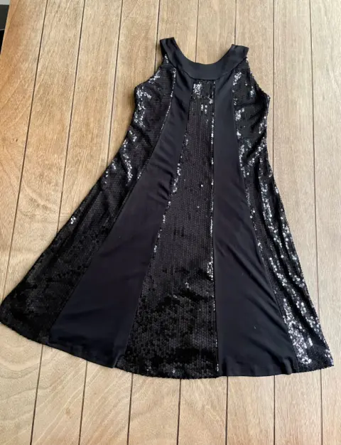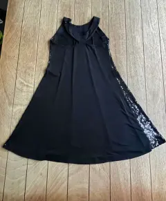 Vestido negro con lentejuelas, súper bonito. Con corte A. En perfecto estado. Muy poco uso. Es talla 1 que equivale a talla xs