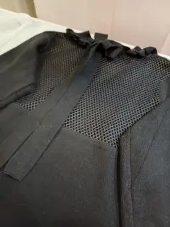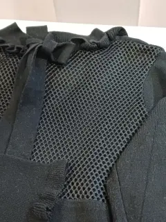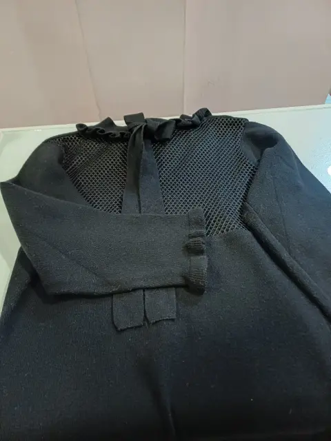 Vestido negro con malla. 🖤Hermoso vestido negro con malla en pecho y mangas de 3/4 con olancitos. Tiene olán también en cuello y cinta para un moñito.🌸La tela ajusta al cuerpo y estira. Si composición es rayón y poliéster. Es suavecito y calientito.🌚Las medidas son ax a ax 41 cm, cintura 33 CM, largo 76 cm, largo manga 42 CM.