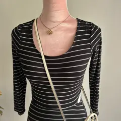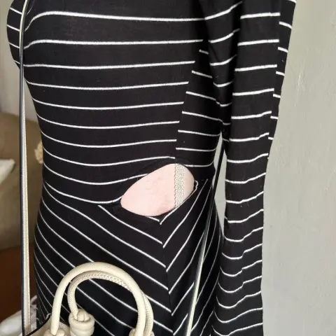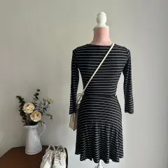 Vestido negro con rayas. ✅vestido casual súper bonito✅muy cómodo✅en perfecto estado✅la tela estira✅tiene cortes en la cintura✅horma súper bonito✅talla XS✅medidas : de axila a axila 35 cm cintura 30 cm largo 82 cm✅aprovecha súper precio 😊✅armo paquetes 📦