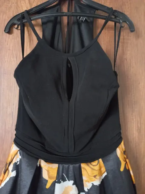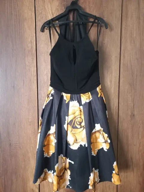 Vestido negro corto floreado. Vestido de segunda mano en buenas condiciones solo con detalles en la falda como los que se ven en la foto, se uso solo una vez .