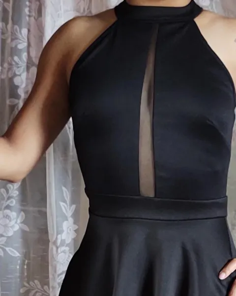 Vestido negro de fiesta. Hermoso vestido muy coqueto y elegante, pequeña parte transparente en el pecho, y en la espalda con bordado de flores, considero que viene fiel a su talla.