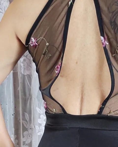 Hermoso vestido muy coqueto y elegante, pequeña parte transparente en el pecho, y en la espalda con bordado de flores, considero que viene fiel a su talla.
