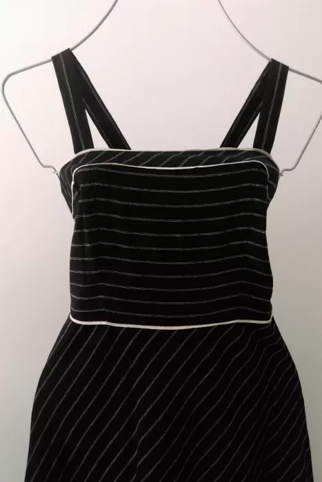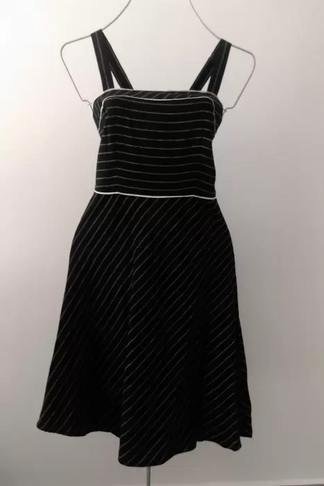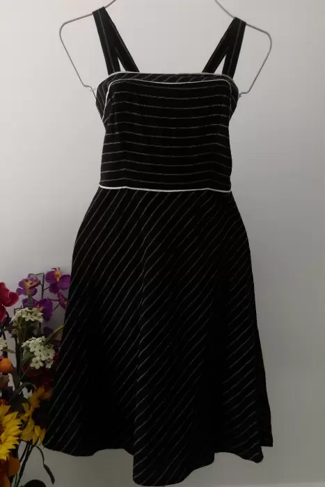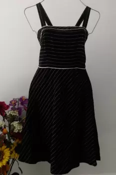 Hermoso vestido color negro con estampado en rayas blancas delgadas, ideal para usar con tu blusa favorita. Fino diseño con tirantes y corte midi. Ajustado en parte superior y con falda con terminado en corte A. Con ribetes blancos en cintura y pecho que ayudan a resaltar tu figura. Tela de Lino muy fresca y confortable, ideal para climas cálidos. Con cierre en costado izquierdo es blusa.Tela: 53% lino y 47% rayónMarca Ann TaylorTalla 6. ChicaMedidas:Pecho 90 cmCintura 74 cmLargo desde tirantes 100 cmLargo desde cintura 63 cmEn perfecto estado. Sin detalles