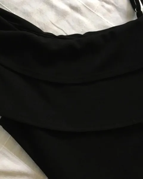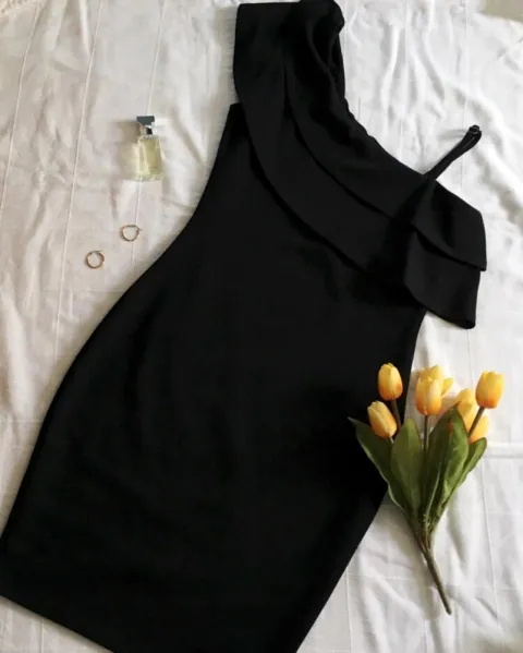 Vestido negro de noche. - Hombro descubierto- Decorado con un Olán- No esta roto