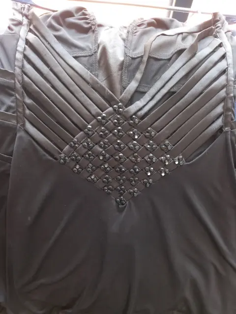 Hermoso vestido simetrico ( corto al frente /largo espalda ) color negro , talla L , detalle de pedreria en la espalda .