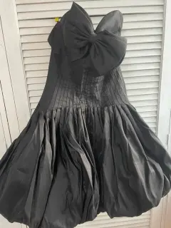 Vestido negro de noche corto con moño enfrente con falda ampona Detalle en moño(le falta un punto)Material de forro y tejido exterior de lino