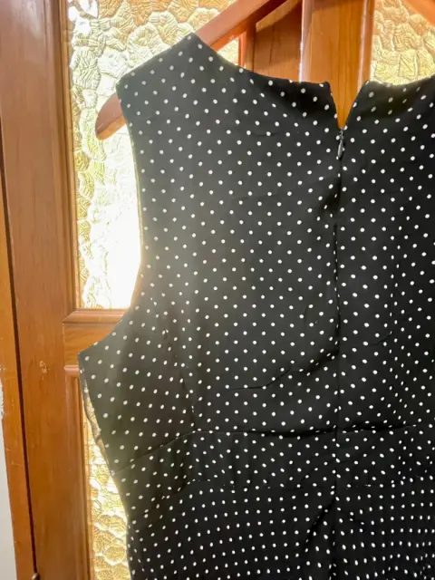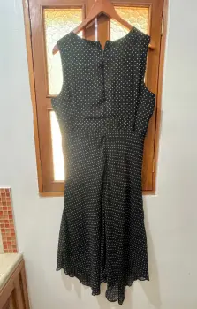Vestido largo, vaporoso, negro de puntos blancos, marca Donna Karan. La parte inferior termina en picos sutiles que le dan movimiento. Ideal para una fiesta, un momento especial o simplemente ¡para sentirte fantástica! Doy regalito con el envío. 😉