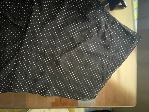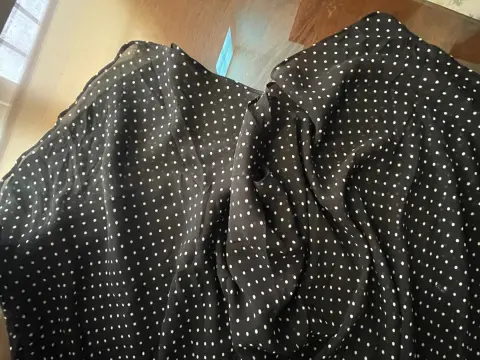 Vestido negro de puntos vaporoso DKNY. Vestido largo, vaporoso, negro de puntos blancos, marca Donna Karan. La parte inferior termina en picos sutiles que le dan movimiento. Ideal para una fiesta, un momento especial o simplemente ¡para sentirte fantástica! Doy regalito con el envío. 😉