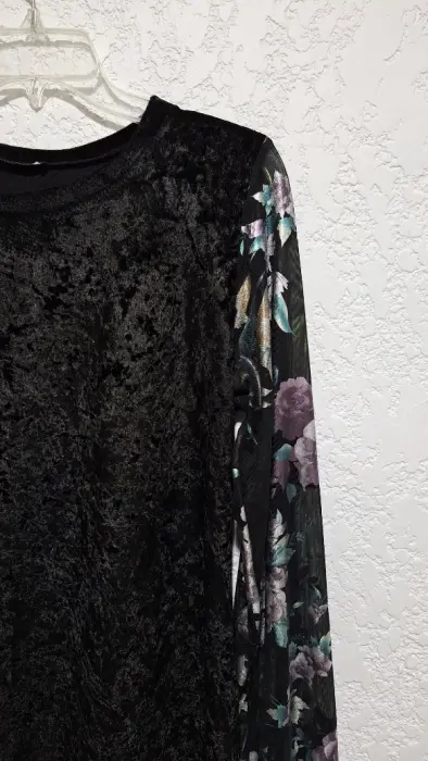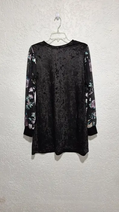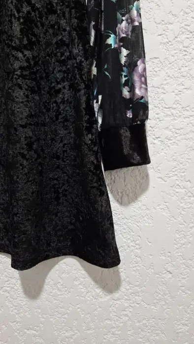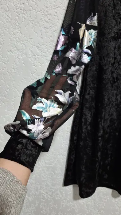 Vestido de terciopelo negro, tiene mangas florales que transparentan como se ve en las fotos.Talla LMedidas: hombros 39 cm, largo 85 cm, pecho 94 cm, cintura 92 cm, ceras 104 cm aprox., largo de manga 67 cm.Armo paquetes según tus preferencias