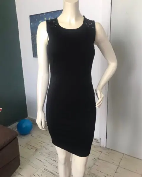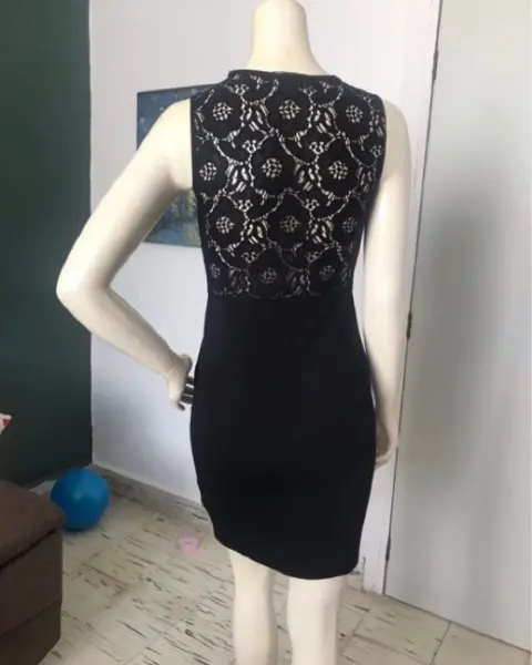 Vestido negro en poliéster stretch y encaje. Escote redondo, encaje desde hombros y espalda hasta la cintura. En la parte delantera a los costados encaje arriba de la cintura. Falda corte lápiz. Talla: XS (22-24) Pide quedar hasta una talla S. Marca: H&M.