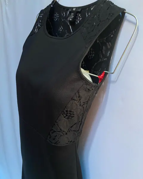 Vestido negro en poliéster stretch y encaje. Vestido negro en poliéster stretch y encaje. Escote redondo, encaje desde hombros y espalda hasta la cintura. En la parte delantera a los costados encaje arriba de la cintura. Falda corte lápiz. Talla: XS (22-24) Pide quedar hasta una talla S. Marca: H&M.