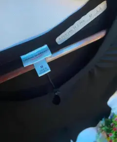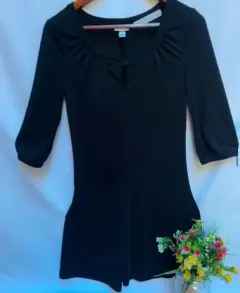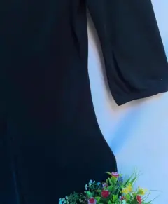 Vestido negro en poliéster y stretch tipo licra A los costados del escote se muestran algunos plisados pequeños que aportan un corte elegante. Cuenta con divisiones pormla parte delantera y espalda para dar una mejor figura al cuerpo y para añadir la amplitud a la falda Falda línea “A”. Mangas tres cuartos, con fruncidoTalla: M (30-32) Marca: IZAAC MIZRAIH