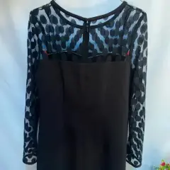 Vestido negro en tergal y encaje de puntos. Escote de tela mate en esstraple y redondo en encaje. Manga larga, pinza corte francés en costado, en la parte delantera tiene bolsas. En espalda cuenta con pinzas de centro y encaje solo en la parte superior.Talla: S (26-28) Puede quedar a una talla MMarca: Eliza Royal Collection.