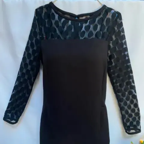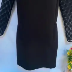 Vestido negro en tergal y encaje de puntos. Vestido negro en tergal y encaje de puntos. Escote de tela mate en esstraple y redondo en encaje. Manga larga, pinza corte francés en costado, en la parte delantera tiene bolsas. En espalda cuenta con pinzas de centro y encaje solo en la parte superior.Talla: S (26-28) Puede quedar a una talla MMarca: Eliza Royal Collection.